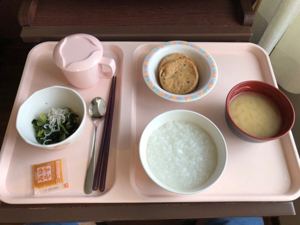 朝御飯の時間になりまして、お粥が変わりました(^^)ゆる〜い物から、お米の形が しっかりしている物に。お味噌汁も付きました!朝食は ほぼ完食出来ました(o^^o)