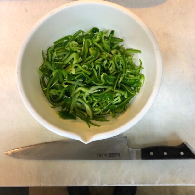 お店の方は、ひたすらピーマンを切りまして〜。これで半分位。