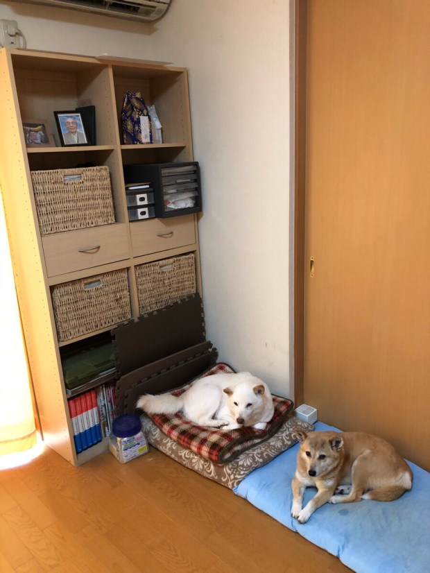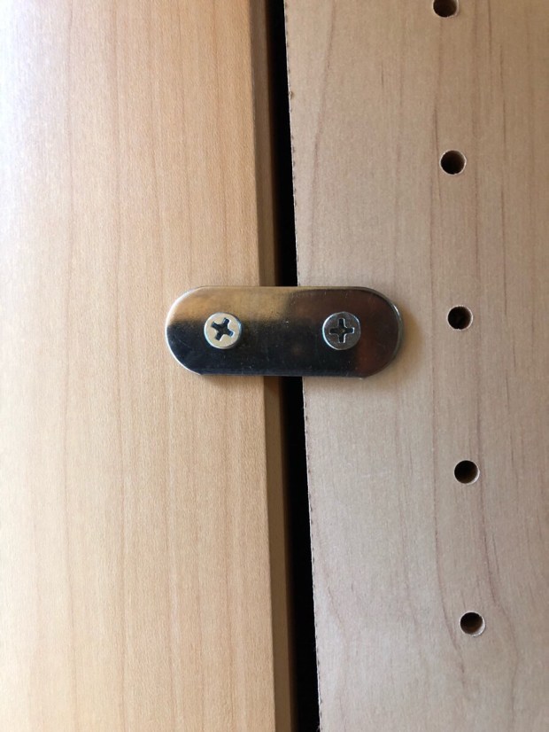 100均で 材料買って、棚と柱を止めました。あちこち関係なく 大きな地震が起きてしまっている状況を考え、コイツが倒れたら 2人は下敷きになつてしまう可能性大ですので、バッチリと止めました。