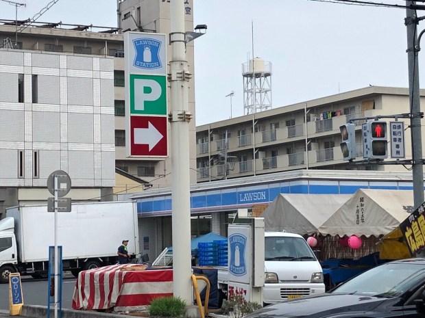 出発して すぐに信号で止まりまして。巡礼者さんが 土日で 沢山寄られたり 写真を撮られた、あのLAWSONです。