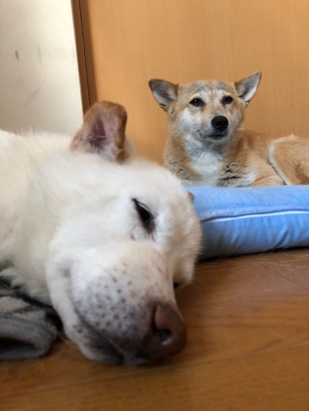 食べて 家に帰ってみたら、エアコン部屋で グータラグッチ君。ヒバ子は 冷静でございました(^^)