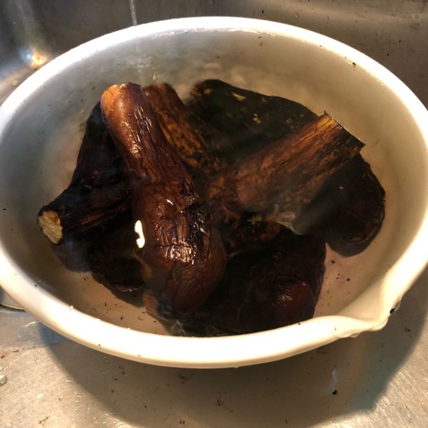 お通しの 焼き茄子も無くなりましたので、またまた 炭で焼きまして、ポチャン!