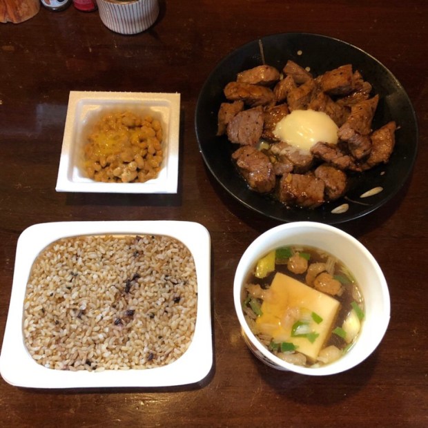 ガッツリとトレーニングしましたので、玄米と十五穀御飯と納豆、豆腐のスープに 割引になっていました、オーストラリア産のガーリックカットステーキ&温玉で ランチタイム(o^^o)