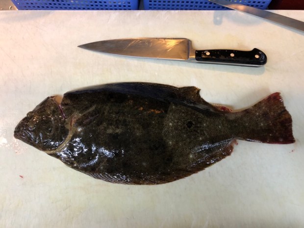 お魚の入荷は、左ヒラメに右カレイの 左さん、天然平目さんが入荷で〜す!小柴産となります。