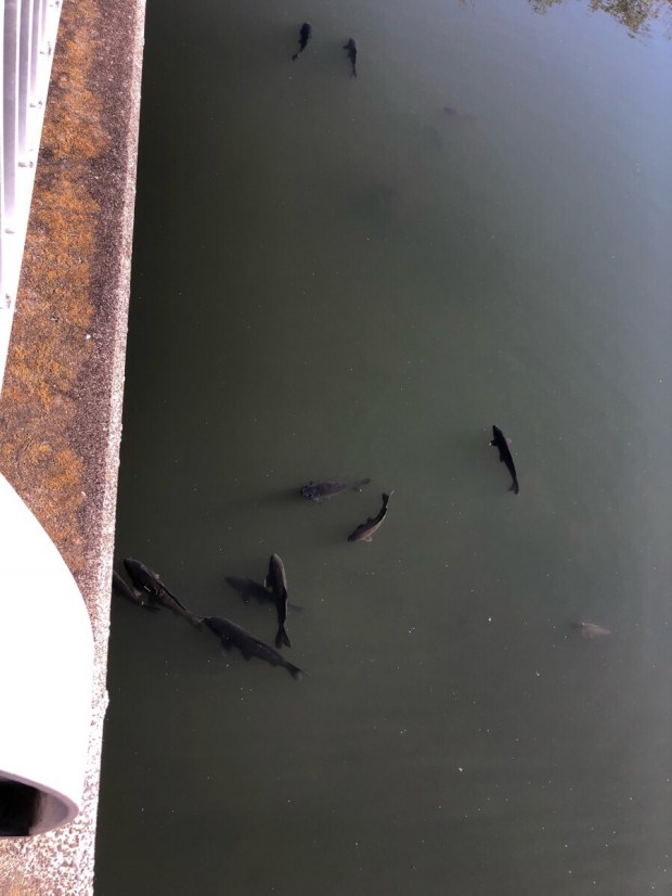 散歩コースの鶴生田川の鯉が 一箇所に集まってまして、パクパクしていました!