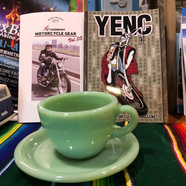 コーヒーの後ろに写っています本ですが、フリーペーパーなんですが、内容的には 軽く2000円は しそうな 写真集的な感じになっておりまして、バイク好きに入ってたまらない品かと思います( ^ω^ )