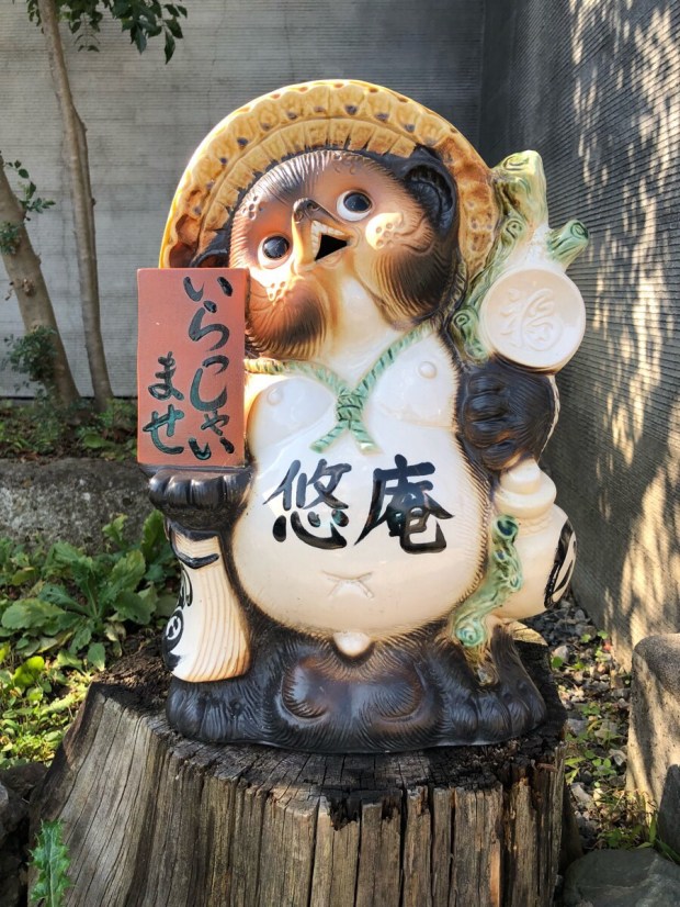 そんな 悠庵さん、館林では 良く見ます、狸が入り口に置いてありました(⌒▽⌒)