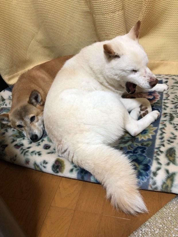 御飯も食べまして、マッタリタイムに入りますと、寝ているヒバ子を踏んづけるように 座りましま お殿様(^^;;