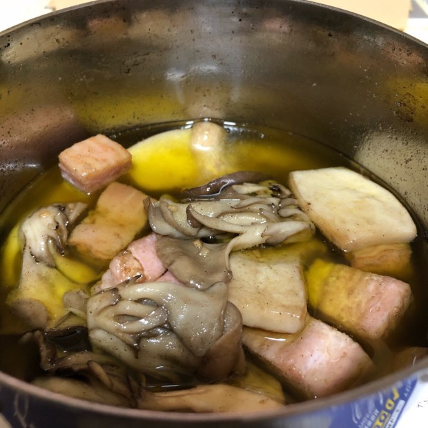 瞬ぴぃのオツマミは、久しぶりに 自分でベーコンとキノコのアヒージョを作りました♪(๑ᴖ◡ᴖ๑)♪