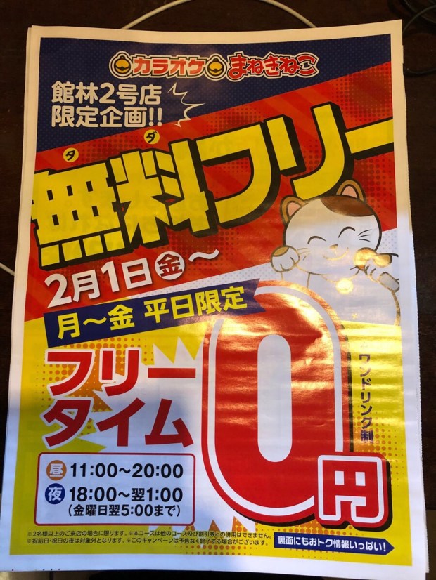 まねきねこの広告が♪( ´▽`) フリータイム、ワンドリンク制で 部屋代0円!!