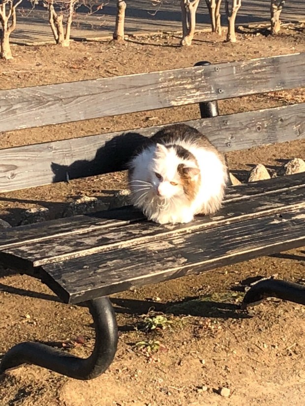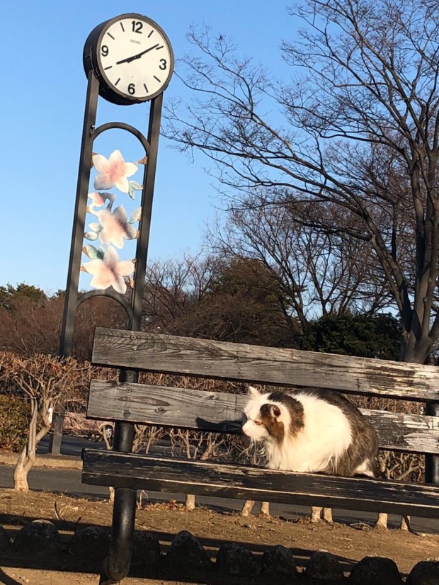 お散歩中には、ニャンコ様が ベンチに座っておりました(^^)