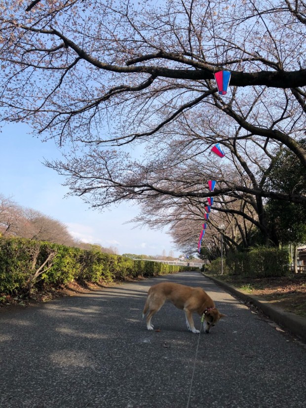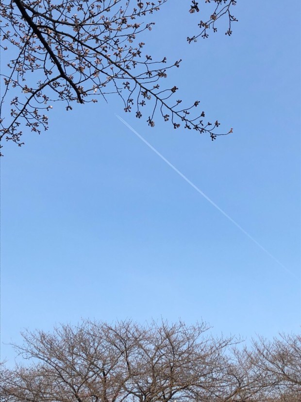 桜の間に 飛行機雲だったりでしたが、2人は 全く興味がないようでした(苦笑)