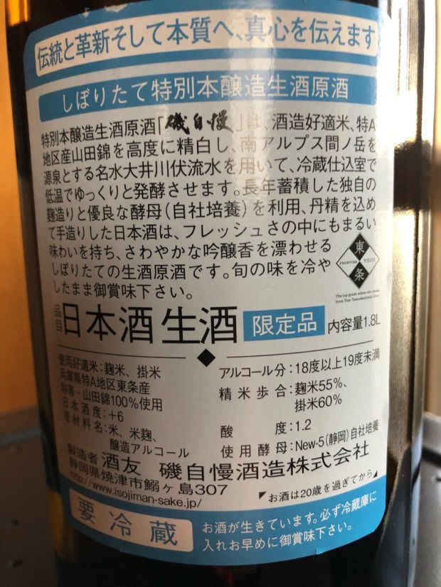 本日買い付けました 日本酒、静岡県 磯自慢 特別本醸造 生酒 原酒。
