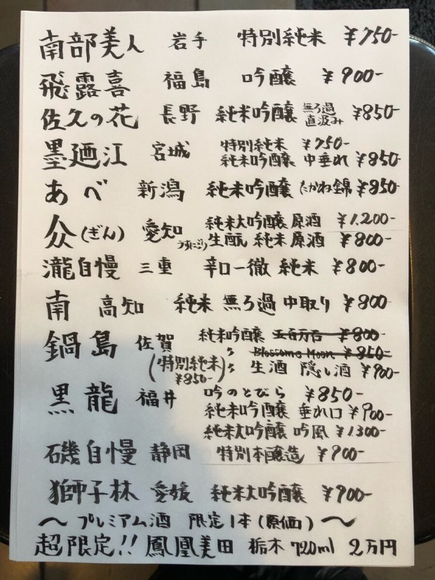 書き足しましての 日本酒メニュー。