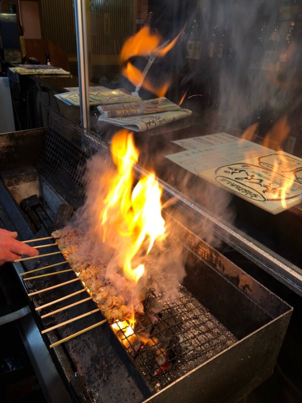 瞬ぴぃの焼き鳥は、炭火で一気に焼き上げでーす٩( ‘ω’ )و