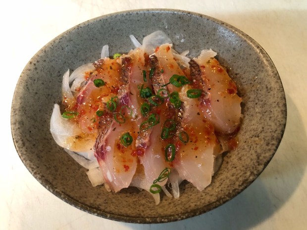 オススメでございます、活〆真鯛の お刺身とー。
