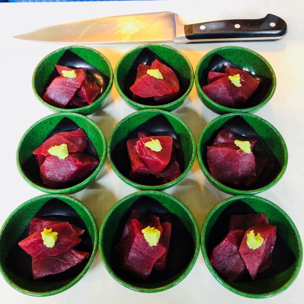 贅沢に ブツ切りしまして、天然生本鮪の赤身ブツでございました♪( ´θ`)ノ