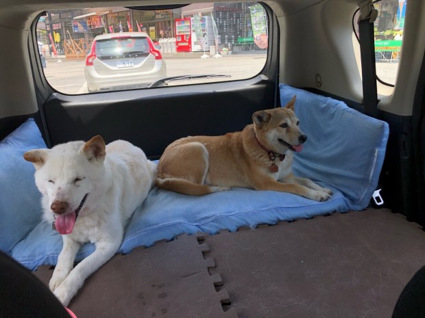 車に戻りまして、エアコン全開にしまして、アクエリアス入りの お水を飲ませてまして、しばし 休憩させまして(_ _).。o○