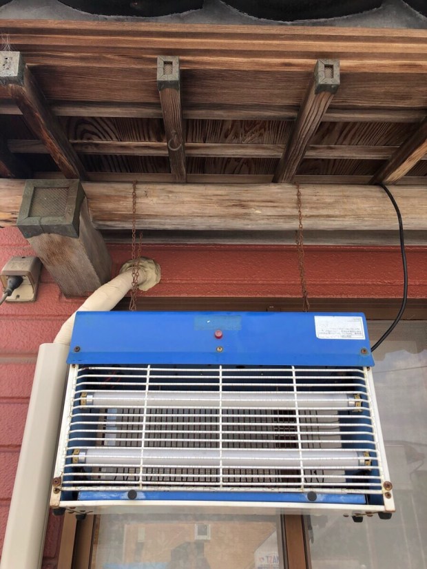 という事で、早めにの対策としまして、お店の入り口の 虫バチバチ電気を今年も取り付けましたー!