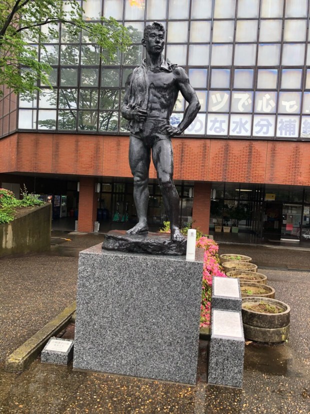 こんな雨の中、水筒が 銅像に置き忘れられておりました。。。