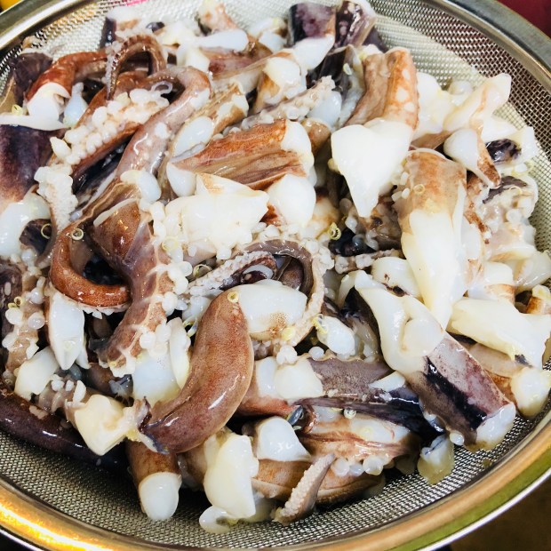 本日、宴会を頂いておりましたので、そちらの仕込みを進めつつ、揚げ物の人気者!イカゲソ唐揚げの仕込みも〜(^O^)/