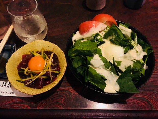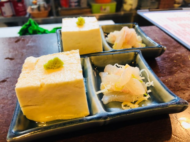 お通しは、こだわり木綿豆腐の奴と 真子鰈の塩ユッケ風(о´∀`о)