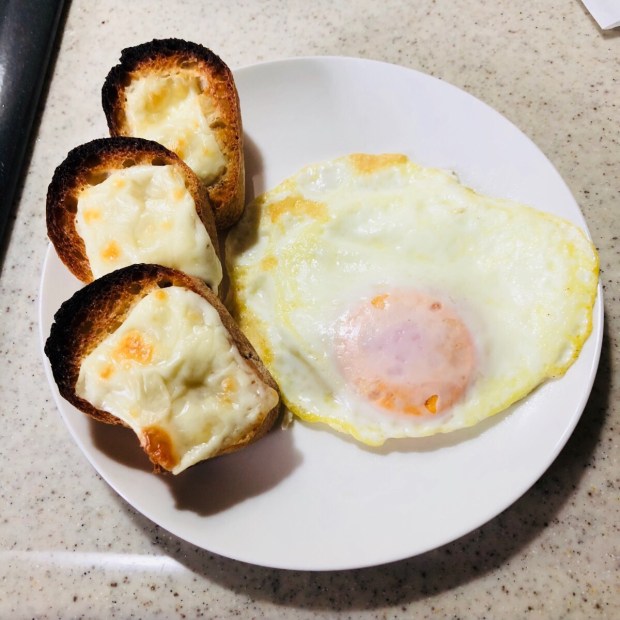 ちょっと焦げてしまいましたが、スライスした バゲットに チーズ+目玉焼き❗️