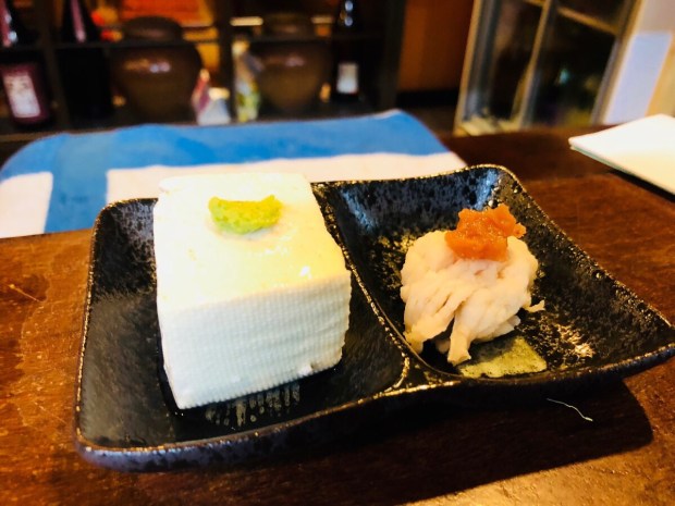 お通しは こだわり豆腐と鱧の梅肉添えでございました。