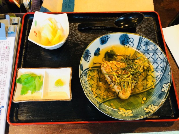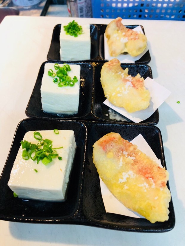 お通しは、こだわり奴に金目鯛の天ぷら付き❗️