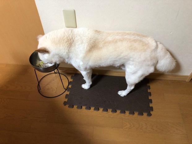 アンヨが滑らないように、滑り止めの上での お食事です(⌒▽⌒)