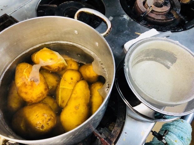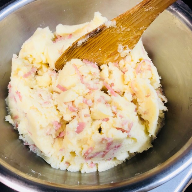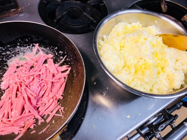 なめらかになーぁれーで、具のベーコン炒め〜のぉ♪( ´θ`)