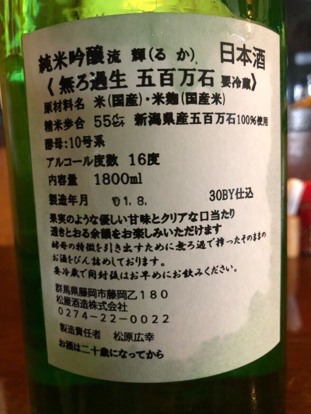 群馬県 流輝(るか) 純米吟醸 無ろ過生 五百万石