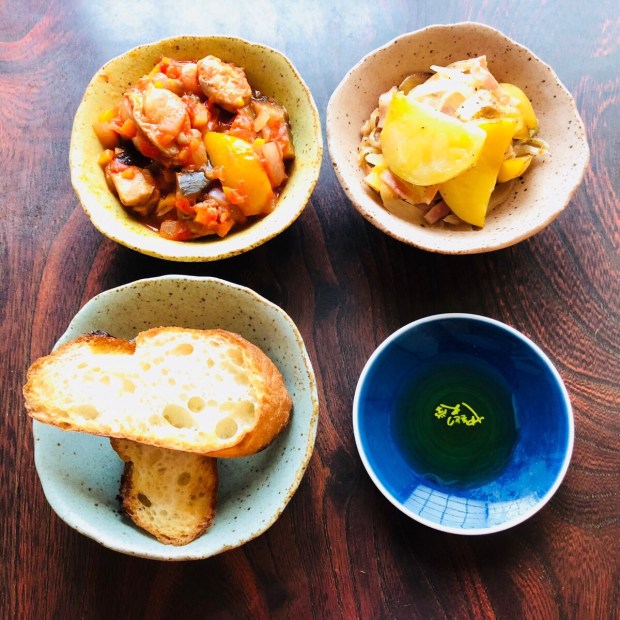 昨日 食べるはずでした、手作りジャーマンポテトとカポナータ&バケットとエキストラバージンオイル(●´ω`●)