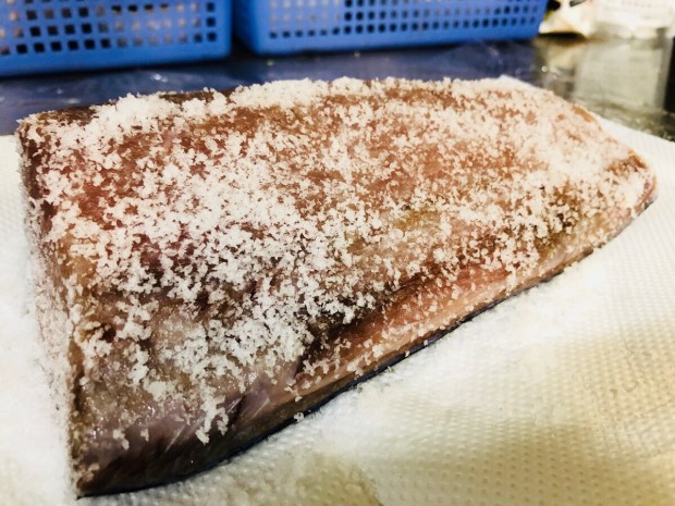 昨日 仕入れました、鰤ですが 塩〆中でございまして、まだまだ水が出てきますので、塩を打ち直しまして、シートも交換(^^)/