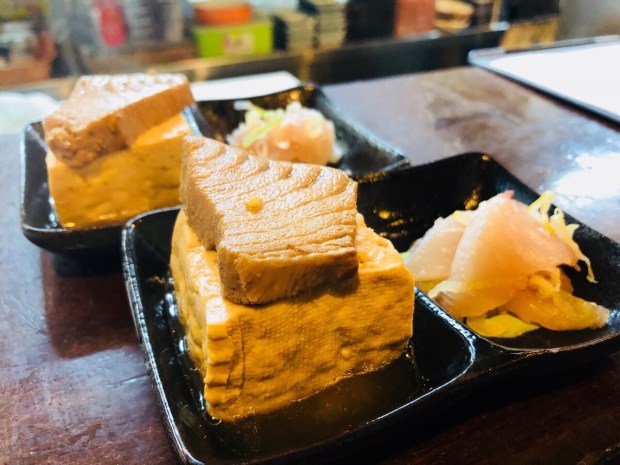 お通しは、コトコト煮ました 鮪の煮豆腐と おばこサワラの塩ユッケ❗️