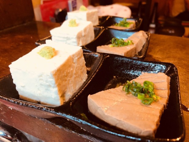 お通しは、こだわりヤッコに 本日も煮ました、鮪の角煮‼️