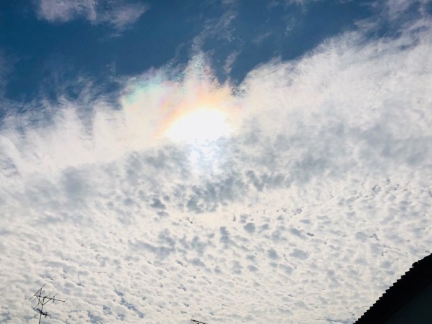 お散歩から 帰って来ましたら、特徴のある雲の中から 太陽さんが ピッカリ〜ン‼️