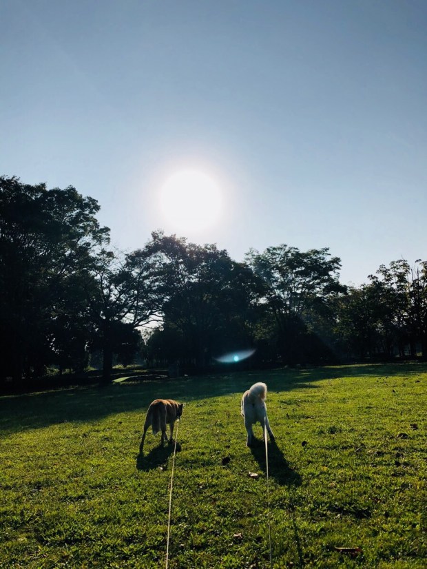 雲ひとつない空の下、朝陽を浴びての お散歩からのスタートU^ェ^U