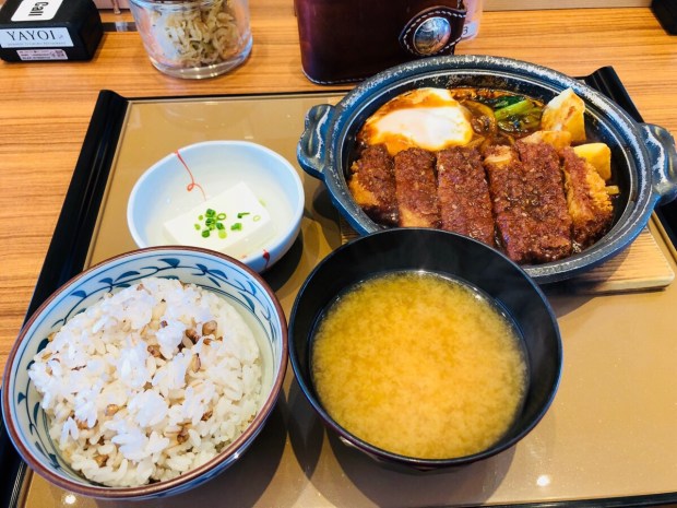 ランチは やよい軒で、味噌カツ定食+もち麦ご飯。