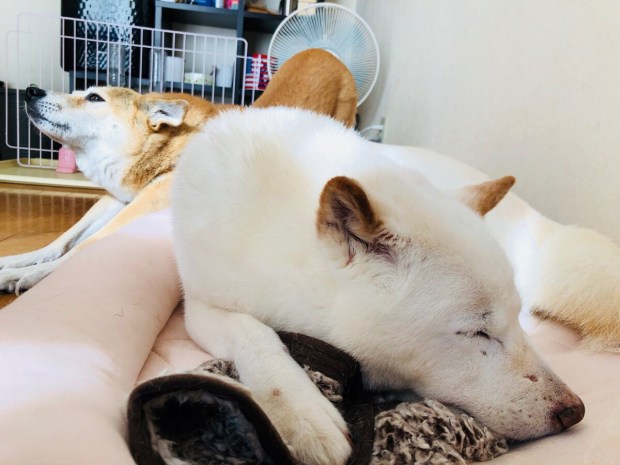 お家に戻りますと、爆睡の お殿様と ノビ〜ッ!の ヒバ子さんU^ェ^U