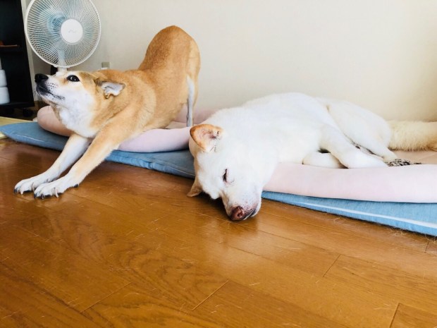 お散歩するのに お家に帰りますと、爆睡の お殿様と、グイ〜ンと ヒバ子さん。