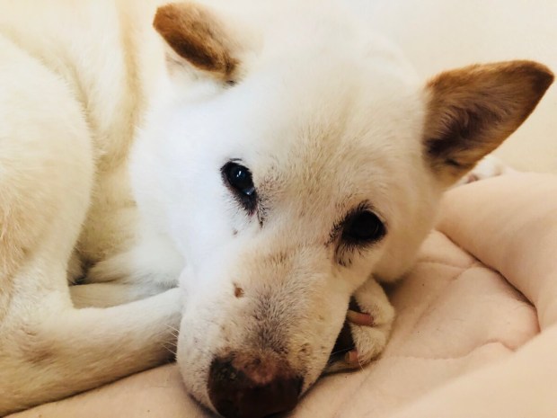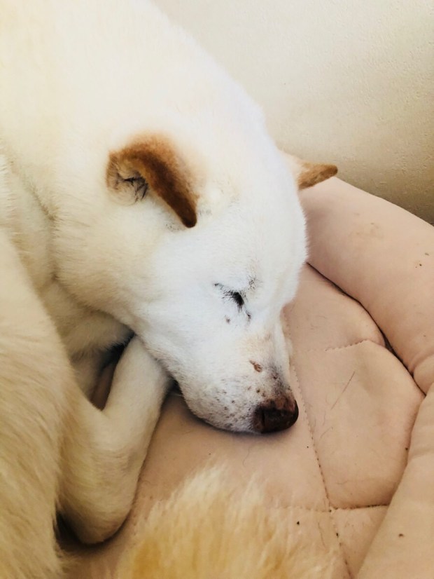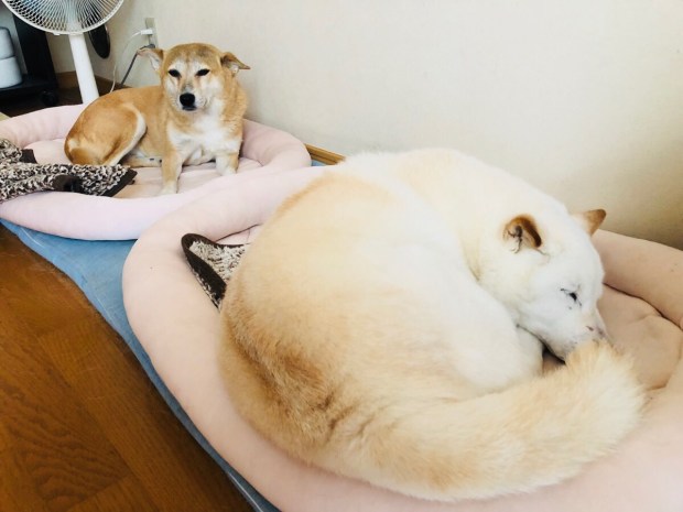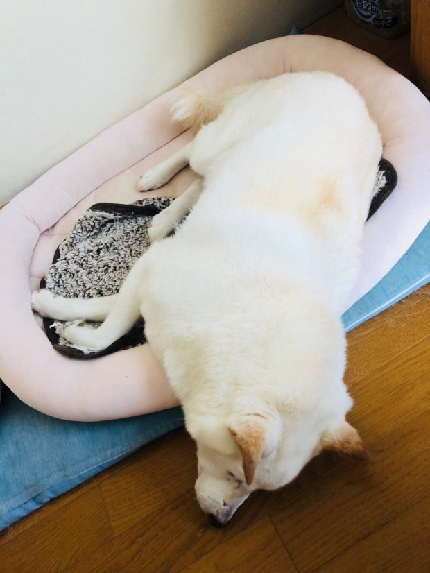 お散歩から 帰って来まして、ご飯を食べさせてから、掃除やら 洗濯やらをやっつけてましたら、お殿様…夢の中へzzz…。