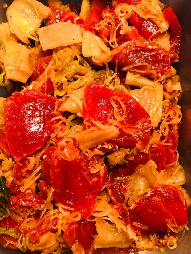 鮪が 微妙な量だけになってしまいましたので、お通し用に マグロキムチを♪( ´θ`)