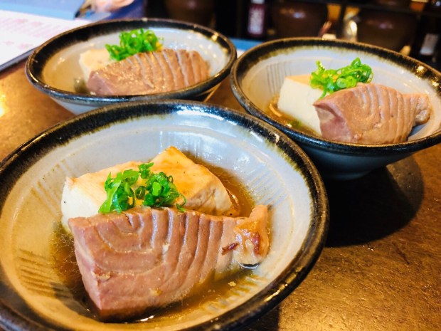 夕方お店に戻りまして、寒かったので、お通しは 鮪の煮豆腐にしました(^^)