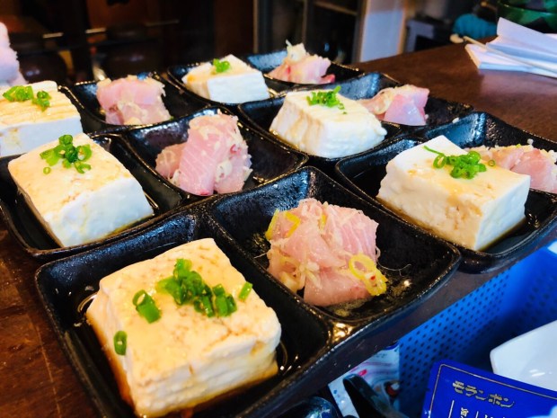 お通しは、こだわり豆腐の湯豆腐&鰤の塩ユッケ風。