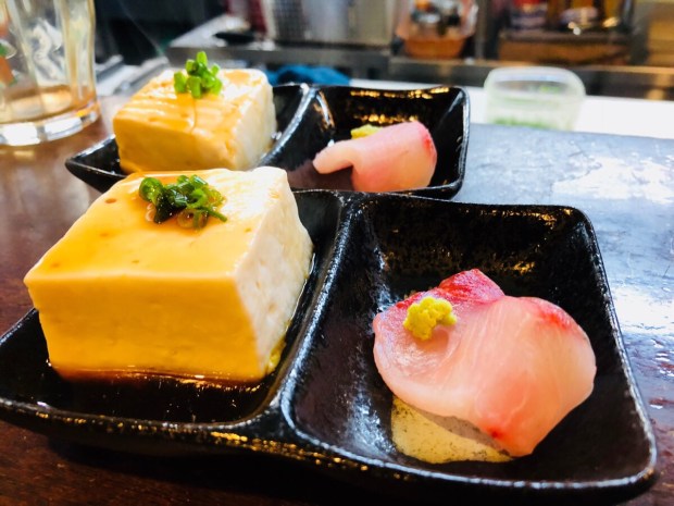 お通しは、湯豆腐に 本日入荷の ロウニンアジを付けちゃいましたヾ(@⌒ー⌒@)ノ