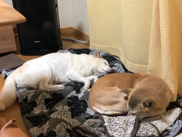 早朝4時半に起床しまして、2人を起こしに行きますと… まだ眠そうな ヒバ子と 爆睡の お殿様(^^)