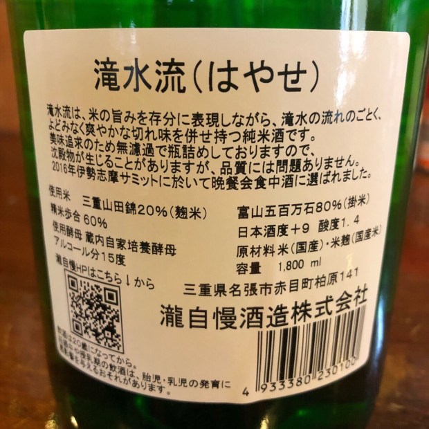 三重県 瀧自慢 辛口一徹純米 滝水流(はやせ)