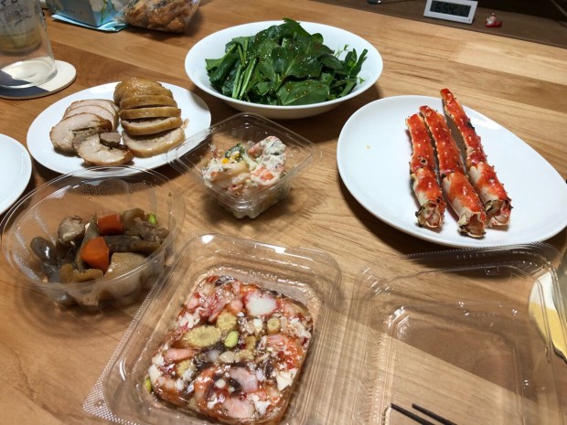 夜ご飯は、大晦日に残った 蟹と サラダほうれん草に、北千住で買って来ました デリ商品(*^◯^*)