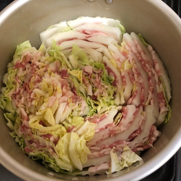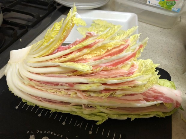 夜ご飯は、豚バラと白菜のミルフィーユ。